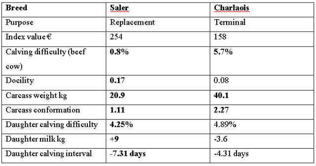 When choosing an AI sire, the first thought that should cross a farmer’s mind is what purpose will the progeny be used for potentially? If any females are potentially to be bred as replacement heifers in the suckler herd then maternal sires with high sub-indices for milk and docility should be used. A number of bulls, particularly those with more terminal characteristics have a negative figure for milk. These are not suitable for breeding replacement heifers. Aim for a figure in excess of +5kg for milk to ensure the progeny will have adequate milk to rear a calf. While carcass characteristics are the most important traits for terminal bulls, they are also of importance for bulls to breed replacement heifers. Remember the cow is 50% of the calf’s genetics.  It’s not uncommon for some traditional breeds with very easy calving characteristics to have negative carcass weight figures, again this needs to be checked and unsuitable bulls avoided. Target a bull with a minimum carcass figure of +10kg for breeding replacement heifers to ensure their progeny have the genetics to grow and perform.