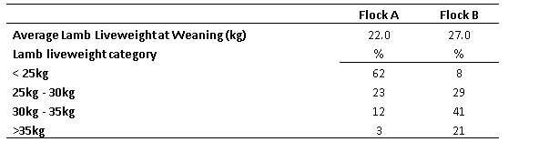 Flock B had a higher average weight at weaning and as can be seen has a high proportion of the lambs above 30kg and the option to potentially finish lambs where grass is available is an option if the economics of it can be stacked up against the store lamb price achievable. Achieving the level of performance from a hill flock demonstrated by Flock B in Table 2 is a result of having a consistent breeding policy, cross breeding an appropriate proportion of the flock and managing the hill to ensure it is in good grazing condition for ewes.