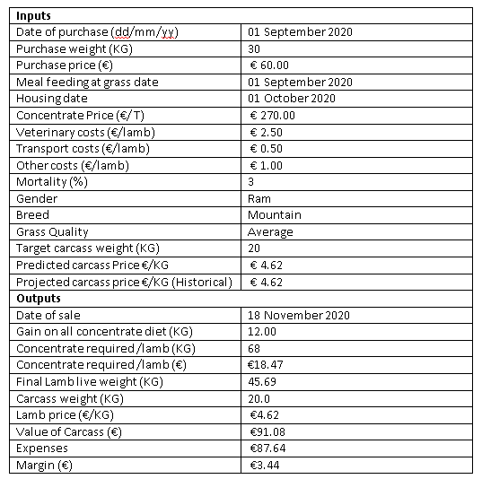 An example of a typical store lamb budget that will be used by flocks is presented in Table 2. This is based around data generated from the Teagasc store lamb calculator which is available here and is for a 30kg Scottish Blackface ram lamb that would be housed in early October for finishing and would make making €2.00/kg as a store currently. This example assumes the lamb still needs to be dosed and vaccinated and that lambs will need to be housed quickly to conserve grass for ewes. Every farm is different and it is important that farmers look at their own circumstances when making these decisions. Where store lamb purchasers are concerned then the availability of grass in the autumn and the option to bring lambs into heavier carcass weights will make finishing a more attractive option.