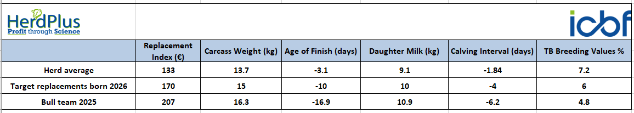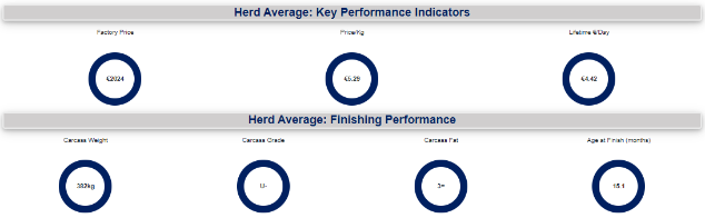 As the herd commences calving in early January the focus is now starting to switch to choosing suitable sires for breeding replacements for the future as well as choosing terminal sires that will deliver heavier carcasses which will in turn increase the gross output of the business. One of the important KPIs on the farm is producing bulls with a carcass weight of 400kg. The average carcass weight of bulls slaughtered in 2024 was 382kg. This can partly be explained because of the age of the herd. The average herd parity is 3.1 calvings per cow. The target is to increase the average calvings per cow to 4.5. A more mature herd will produce more milk which should help achieve higher weaning weights.