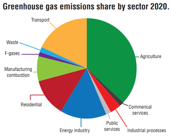 In agriculture, methane makes up 68% of total Irish agricultural emissions,while nitrous oxide makes up another 29.3%. Carbon dioxide only accounts for 2.7% of our agricultural emissions.