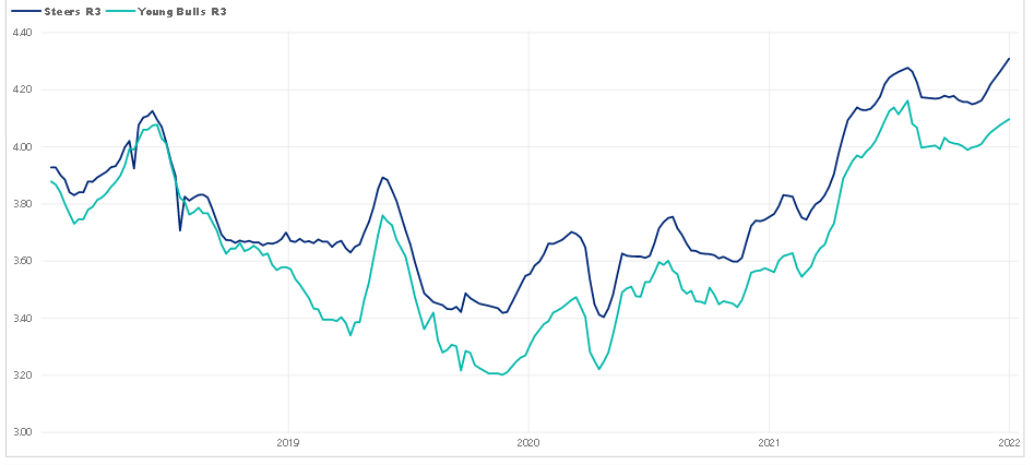 Figure 1. Irish steer versus young bull beef price 2018 -2021 (€/kg ex VAT). Source: Bord Bia