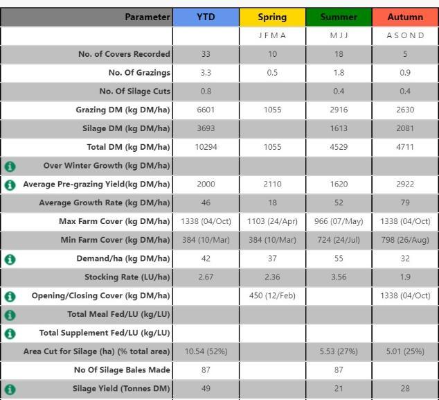 As Cathal is using pasture base, he can generate a farm summary report which highlights how the farm performed from a grass point of view.