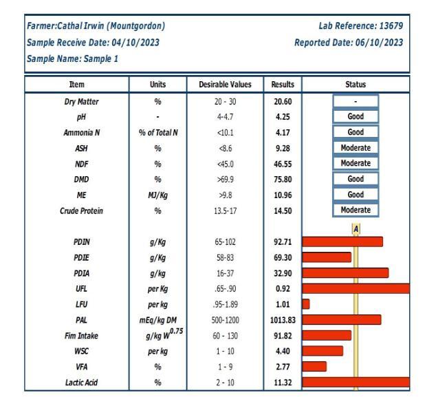 In order to make improvements in the quality of the silage, Cathal reseeded the main silage field. The field had a high percentage of weeds and docks and the ryegrass was disappearing. This year, he fertilised the silage group in the first week of April to target an earlier cutting date in May. Despite a wet enough May, Cathal got a window of a few dry days and got the silage made. He tested this silage in mid – October and below are the results.