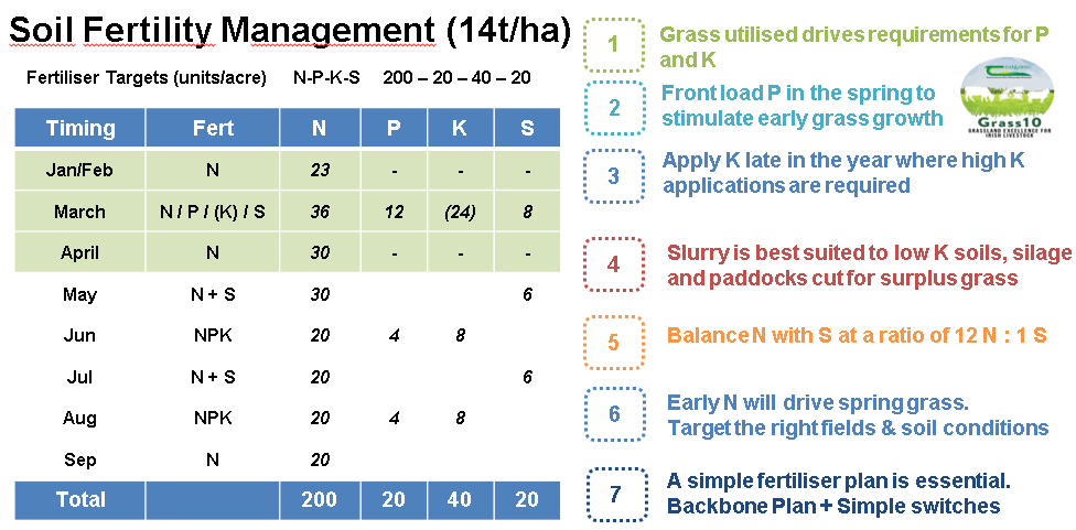 Nationally, Irish dairy farmers are spreading 185kgs/Ha (148units/acre) across the whole farm, but there are huge variations between farms and also between fields within farms. The milking platform typically tends to be fertilised more intensively than outside blocks that may be used for silage or the rearing of replacements.