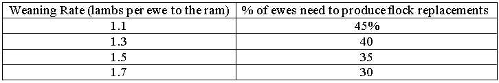 The next step is to ensure that enough replacements are produced. The number of ewes that must be mated with a ram to produce replacements will depend on the weaning rate of the flock and the number of replacements that needs to be retained. The table below shows the percentage of the flock that needs to be mated to a replacement producing ram to generate 24% replacements annually.