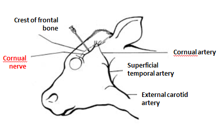 A cauterisation method (i.e. using a heated disbudding iron) is used to remove the horn buds. The best location to anaesthetise is halfway between the base of the ear and the corner of the eye. Feel for a bony ridge in this area; the cornual nerve runs under that ridge (Figure 2). Insert a 5/8” needle up to its hub under the ridge and inject 2ml of the local anaesthetic (Adrenacaine). Pull back while still injecting so that the last bit of local is injected just below the skin. Then repeat on the other side.
