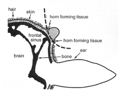 It becomes a bony extension of the skull with the hollow centre of the horn opening into the frontal sinus. The brain lies directly under the frontal sinus covered by a thin layer of bone. Dehorning after the horn attaches increases the risk of entering the frontal sinus and subsequent infection.