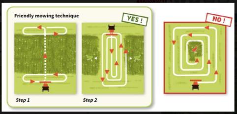 Up to 60% of chicks are killed when mowing from the inside in. Corncrakes are shy secretive birds and are reluctant to break cover and move to open ground. Corncrake friendly mowing is to provide birds with continuous cover as they escape from the mower into a neighbouring field or refuge area. Firstly, it is important to maintain a slow mowing speed (between 5-6km/hr) which allows adult birds and chicks to escape from the front of the mower. Secondly is to carry out mowing in such a way that birds are pushed to the edges of the field. If mowing is carried out in an appropriate way, it will have a major impact on the survival rates of both chicks and females.