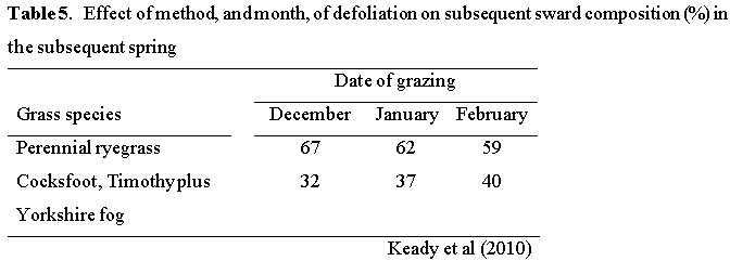 Ewes are allocated relatively small areas of pasture in extended-grazing systems as typically the area involved has a heavy cover of herbage. A study was undertaken to evaluate the effects of extended grazing management on sward botanical composition; the results are presented in Table 5. Delaying grazing date resulted in a reduction in the perennial ryegrass content of the sward and the combined content of Cocksfoot, Timothy and Yorkshire Fog increased. Therefore extended grazing will lead to a reduced reseeding interval.