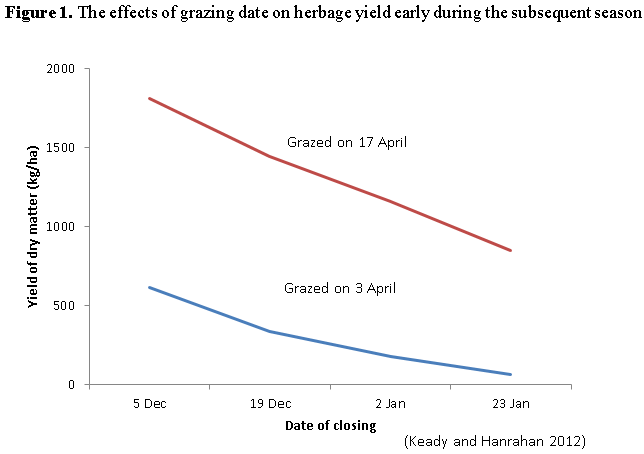 - Each 1 day increase in the length of the interval between closing and extended grazing reduces herbage DM yield during the subsequent spring (depending on day of grazing) by up to 35 kg/ha; equivalent to 12 ewe-grazing days.