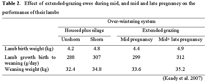 The results of one of these studies are presented in Table 2. Relative to ewes that were housed and unshorn, extended grazing increased lamb birth weight and growth rate from birth to weaning and, thus, increased weaning weight. Extended grazing throughout mid- and late-pregnancy resulted in a greater response than extended grazing during mid-pregnancy only. However, when compared to ewes that were shorn at housing, extended grazing had no beneficial effect on ewe or lamb performance.