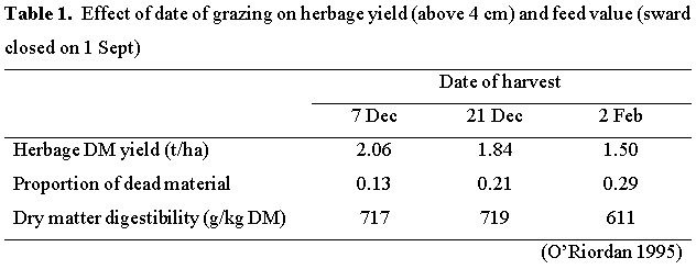 As the date of extended grazing is delayed the proportion of dead herbage increases and herbage feed value, as determined by DMD (dry matter digestibility), declines. Also herbage dry matter (DM) yield declines after a period due to leaf senescence and decay.