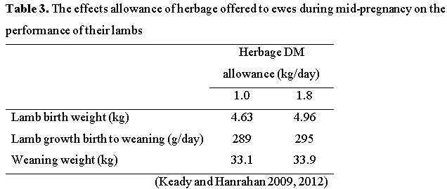The effects of herbage allowance offered to ewes during mid-pregnancy (early December to 4 weeks prior to lambing) on the performance of their lambs were evaluated in two studies at Athenry; the results are presented in Table 3. Increasing herbage DM allowance by 0.8 kg/day increased daily forage DM intake by 0.19 kg per ewe. Thus, only 24% of the additional allocated herbage was consumed by the ewes. Lambs from ewes on the higher grass allowance were heavier at birth (+0.33 kg) and at weaning (+0.8 kg) and grew faster from birth to weaning (+6 g/day).