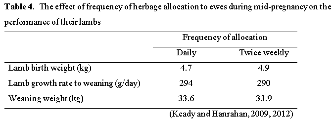 The effect of frequency of herbage allocation to ewes in mid pregnancy on the performance of their lambs was evaluated at Athenry (Table 4). In these studies the ewes were extended-grazed from mid-December to 4 weeks prior to lambing, at which stage they were housed and offered grass silage ad-lib and a total of 19 kg concentrate prior to lambing. During extended grazing the ewes were allocated herbage either daily or twice weekly. Frequency of herbage allocation had no effect on lamb birth or weaning weight, or on lamb growth rate from birth to weaning.