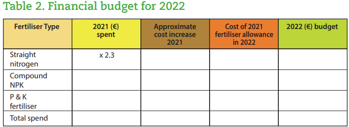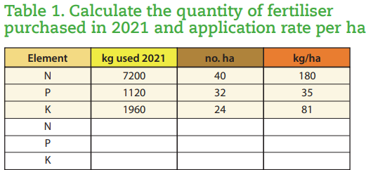 • How much was spent on fertiliser in 2021? This will form the starting point for a fertiliser budget. Plan how much you can afford to spend in 2022 (Tables 1 & 2)