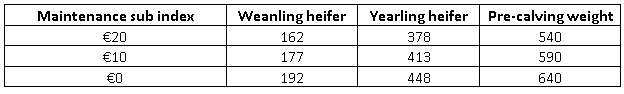 So assuming a pre-calving weight of 540 kg, this equates to approximately 162 kg for the weanling and at least 385 kg for the in-calf heifer. Target 1st August weights for heifers of different maintenance sub index are detailed in the following table.