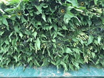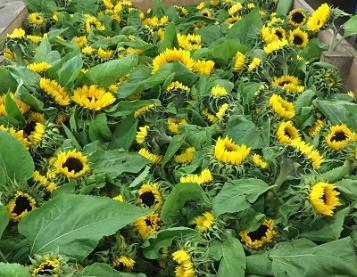 While sunflowers are more robust than other cut flowers, care must be taken during picking and sale. Additional storage and transport space will be needed and greater labour to handle the crop compared with other crops. Cut stems will need to be put into water as soon as possible after picking to avoid rapid wilting. On a small scale, irrigation shortly before picking can improve shelf life after harvest. Recommended picking stages vary from cutting tight when the ray florets are barely visible to almost completely open. A useful compromise is to pick when the ray florets are between half and fully expanded usually when the petals are perpendicular to the flower head. If picked too tight and stored cool, they may not open properly. Stems with blemishes or spotting on the flower heads are unlikely to be acceptable. Remove all but 3-4 leaves as leaves will reduce shelf life significantly. Cut stems can be kept for up to a week in a cold store. A shelf life up to two weeks can be achieved by using suitable flower foods such as ‘Chrysal CVBN’(sodium dichloro-s- triazinetrione, hydrated).