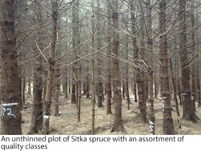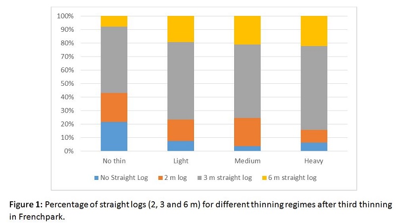 Thinning when carried out correctly allows the forest owner to divert valuable site resources to better quality trees, resulting in trees of higher value. Results from Frenchpark illustrate the benefit of thinning. Overall there is a significant an increase in the quality of with a greater percentage of straight logs in all the thinning treatments compared to the unthinned plots and as thinning intensity increases so those timber quality. For more heavily thinned plots, over 83% of the stems are capable of achieving at least a valuable 3 m straight log compared to 75% of the stems for the medium thinning and only 56% of stems for the unthinned plots. There is limited potential to influence the quality of trees in unthinned plots (Figure 1).