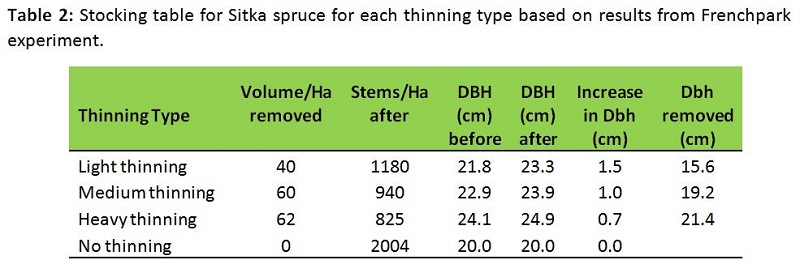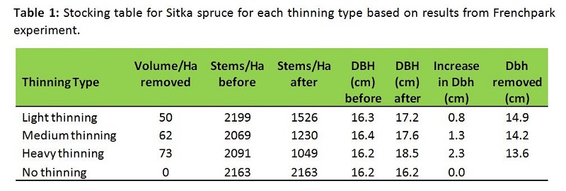 Volume removal in the Frenchpark experiment ranged from 50 to 73 m3/ha. While majority of the volume removed at first thinning is pulpwood (60 to 70%). Some palletwood is produced (20 to 30%) from heavier trees on the removed line, where better trees may produce one or two lengths of palletwood. In terms of financial returns a light thinning may return €450/ha, a medium might be worth, €560/ha and a heavy thinning may be worth €610/ha, owing to a higher volume produced.