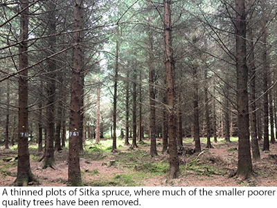 Many crops of Sitka spruce planted in the 1990’s on out farms are now showing exceptional growth rates, which require earlier management than the crops traditionally planted on more marginal ground. In many cases these crops are suitable for first thinning at 15 years of age, due to the mix of good genetic stock resulting in rapid juvenile growth on favourable sites.