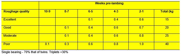 Meal feeding (kg per head per day) level for twin-bearing mature ewes in good body condition.
