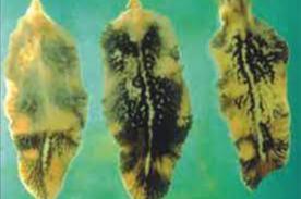 The Liver Fluke parasite, Fasciola hepatica, is a parasite which affects cattle, sheep and goats. Adult fluke (Figure 1) in the bile ducts lay eggs which pass on to the pasture in the faeces. The eggs require mild conditions for the larvae to hatch and after some time, these enter the intermediate host, the mud snail, where they undergo further development. This snail is even more dependent on the presence of moisture and warmth. The immature flukes leave the snail and develop further until they reach the ineffective stage where they become attached to the herbage. It is only when ingested by the animal at this stage that they are capable of migrating through the body, reaching the liver and thus completing the cycle.