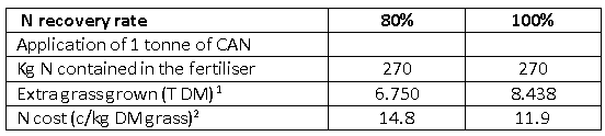 The response in terms of plant dry matter and the Nitrogen costs per additional grass dry matter grown are presented in the following table following the application of one tonne of CAN.
