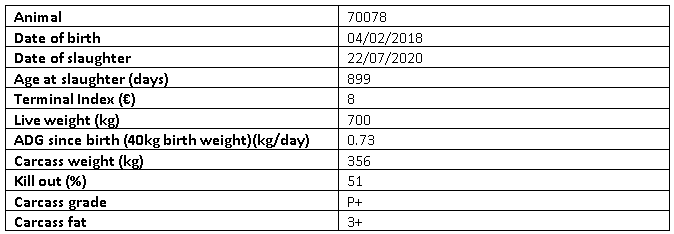 Standing at 700kg prior to transport, steer 41106 produced a 362kg carcass (51.7% kill out) and was above target in terms of the Teagasc beef production guidelines for a 28-30 month Holstein Friesian steer.