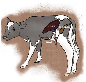 While in the womb, the umbilical cord is the vital link providing nutrition from the mother to the foetus. However, once the calf is born and on the ground the navel is probably its greatest threat. The navel is a gateway for bacteria and disease that exist in the calf’s environment to enter the calf’s body. From there it can enter the bloodstream and spread throughout the body.