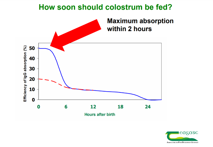 A calf is born with an under developed immune system. It is dependent on getting the antibodies in its mother’s colostrum to fight off infection. We all know to have adequate protection the quality of the colostrum has to be good and the calf has to get enough of it, three litres. But what is often less talked about is that we also have to give the calf the colostrum as soon as possible after birth, preferably within two hours. Why?