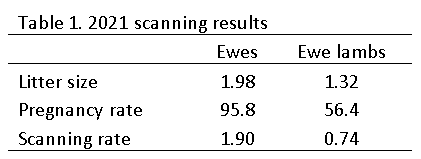 Patrick’s lowland flocks consists of Suffolk-X, Belclare-X and Llyen-X ewes that are managed completely separate to his hill ewes. This self-contained flock produced its own replacements and finished the remaining lambs to the factory. These ewes are due to lamb this year from the 20th of March onward. To boost numbers a total of 39 ewe lambs were joined for a limited window to coincide with the start of lambing. The ewes and ewe lambs were scanned in early January and the results are in Table 1. The overall scan for the ewes was on target after a 5 week joining period, the lower pregnancy rate in the ewe lambs is reflective of the duration of the joining period, with a good litter size for those pregnant.
