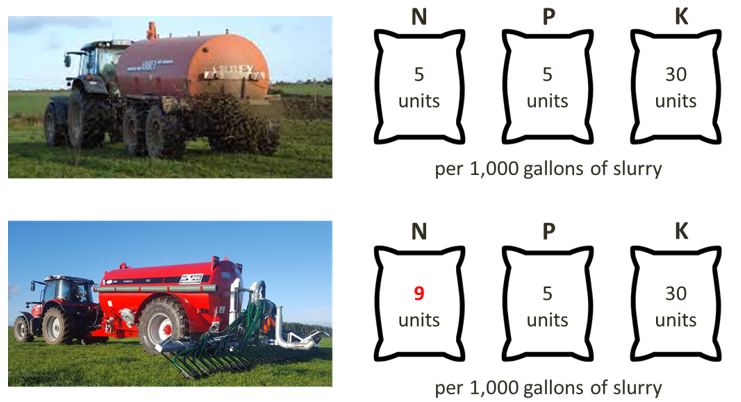 Better value through better use of slurry Nitrogen. Moving towards the summer and silage cutting, the target to is to get slurry returned to the silage fields as the silage crop will have removed a large amount of N, P and K from the soil. Cattle slurry typically when spread with a splash plate contains 5 units of nitrogen, 5 units of phosphate and 30 units of potash per 1000 gallons (5-5-30 N-P-K). By using a dribble bar or trailing shoe we can boost Nitrogen value up to 9 units by reducing the loss of nitrogen to the atmosphere. This represents greater than 50% increase in Nitrogen values from the same slurry.