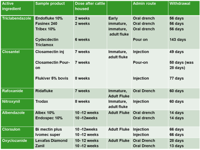 There are 7 different active ingredients that control liver fluke, see the table below.