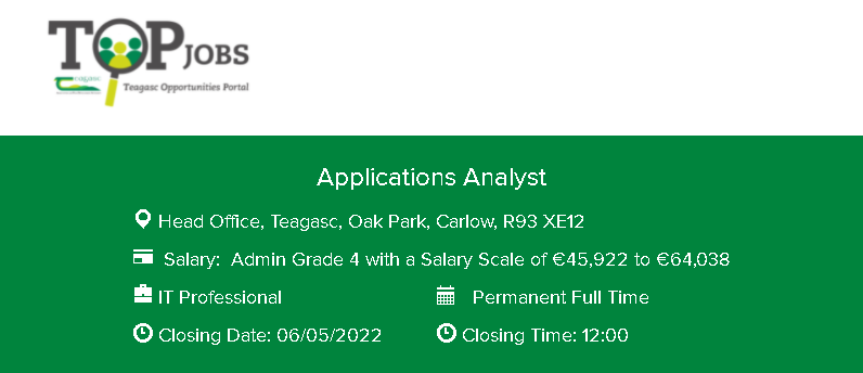 Teagasc has a vacancy for an Applications Analyst (Permanent) at Head Office, Teagasc, Oak Park, Carlow. Candidates must have a QQI Level 8 Qualification in Computer Science, Information Technology or other relevant qualification. Read details of post and salary here. Closing date 6th May 2022.