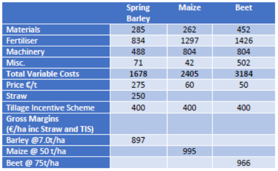 Farmers should tread carefully as all tillage crops need to achieve relatively high yields before realising profitability. Below are costs of production and possible margins for spring barley and maize and beet.